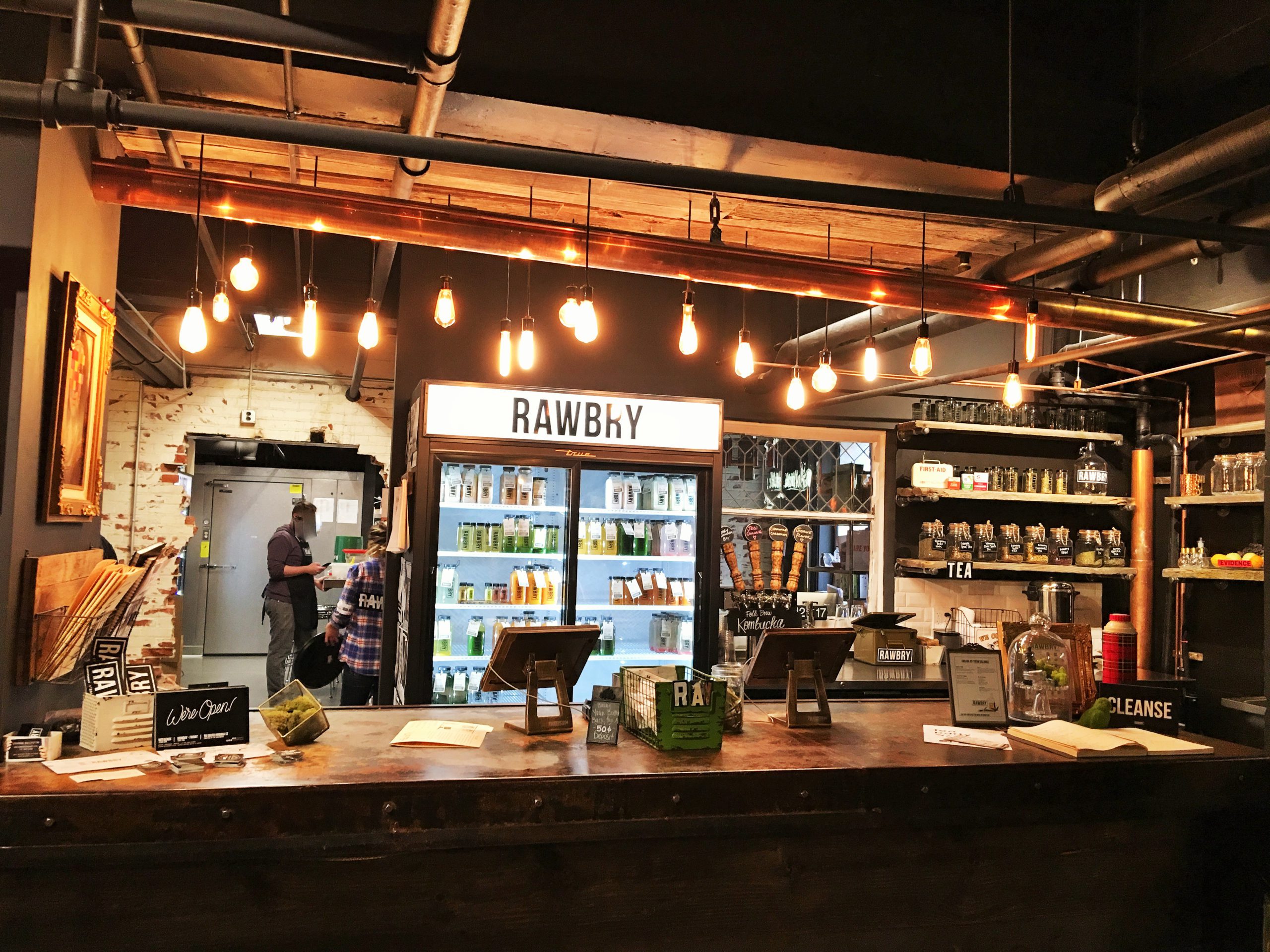 階段をおりてすぐのところに珈琲店のGlobal Coffeeとヘルシージュースとスムージーのお店のRawbryがありスペースも広く、West Elmでのお買い物後にひとまずゆっくり休憩できます。