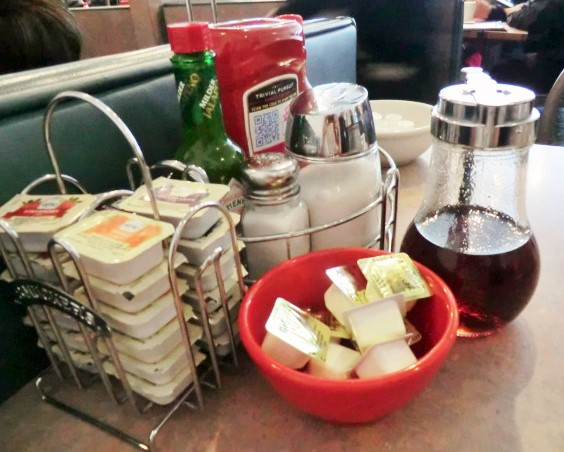 テーブル卓上には朝食に欠かせないシロップ、ケチャップなど代表的なものが揃っています。ジャムは苺、オレンジ、葡萄、ブラックベリーの4種もありました!ホットソースは赤と緑のソース2種もあり。メキシコ風朝食には欠かせないです。